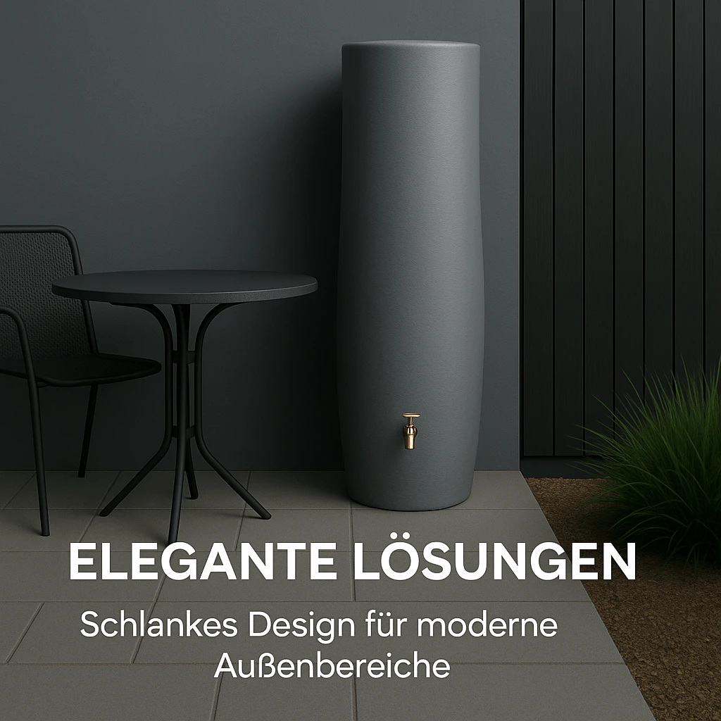 Säulenförmige Regentonnen gehören zu den flexibelsten und zugleich elegantesten Designs. Durch ihre schmale, vertikale Silhouette lassen sie sich selbst dort integrieren, wo kaum Stellfläche vorhanden ist: neben Türen und Fenstern, zwischen Pflanzen, an engen Hauswänden oder auf schmalen Terrassenflächen. Ihre runde Form sorgt für ein harmonisches Gesamtbild, das sich sowohl in moderne als auch natürliche Gartendesigns einfügt.