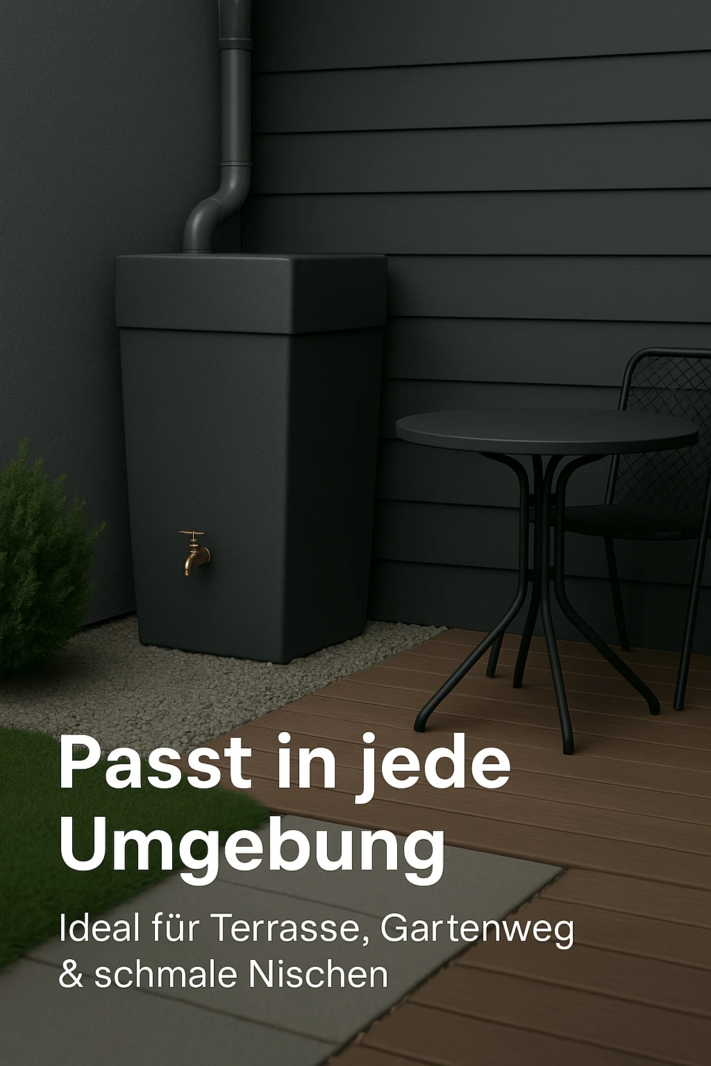 Eckige Regentonnen sind die erste Wahl für alle, die einen strukturierten, modernen Gartenstil bevorzugen. Mit ihren klaren Linien passen sie perfekt zu kubischen Gebäuden, glatten Fassaden, Metall- und Glas-Elementen oder minimalistischen Terrassen. Sie wirken bewusst reduziert und lassen die Architektur deines Hauses optisch weiterlaufen, statt als Fremdkörper aufzufallen.
