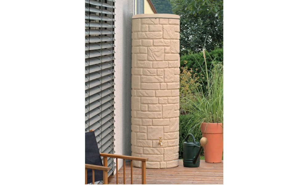 Diese Regentonne überzeugt durch ihre naturgetreue Nachbildung einer Natursteinsäule oder eines kleinen gemauerten Brunnen.