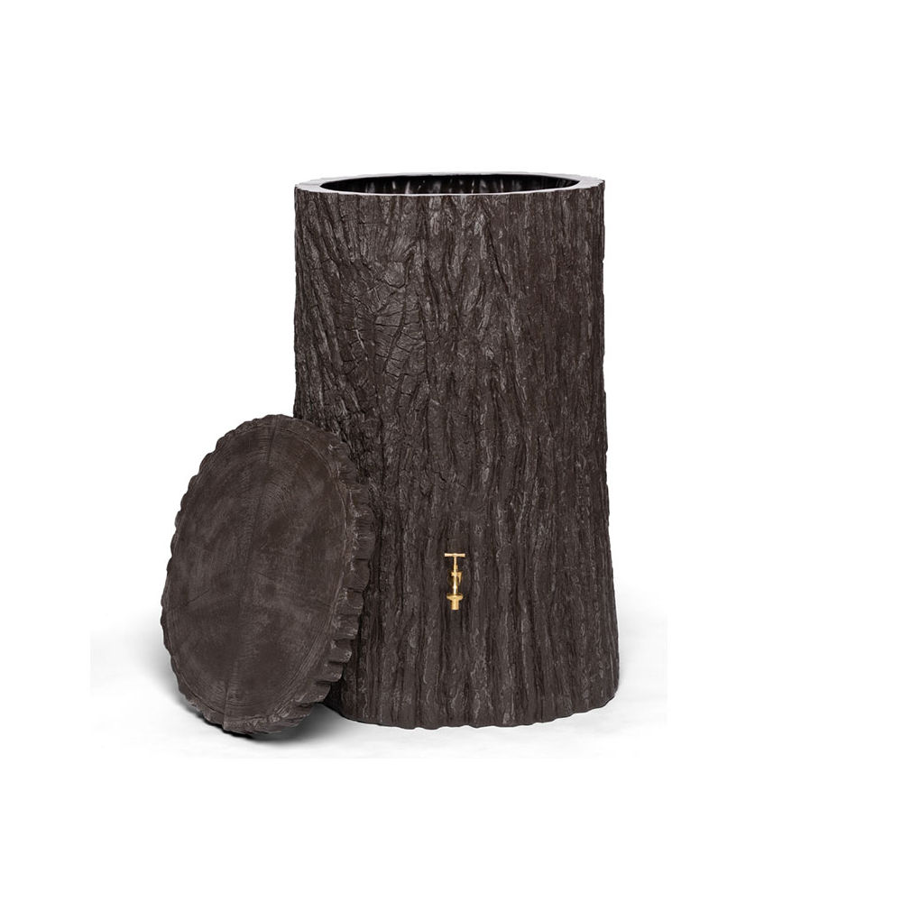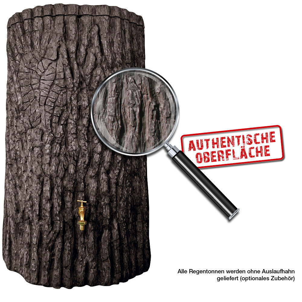 Der Stamm einer deutschen Eiche hatte uns die Idee und gleichzeitig auch das Modell für diese einzigartige Regentonne vorgegeben. Durch eine spezielle Nachbehandlung des witterungs- und UV-beständigen PE-Kunststoffes erzielen wir eine naturgetreue Nachbildung, die von dem Original kaum zu unterscheiden ist.