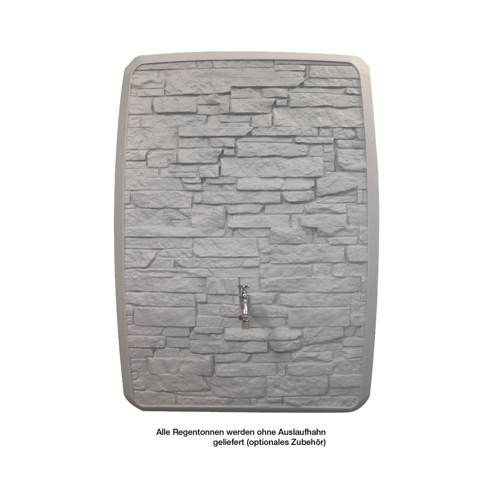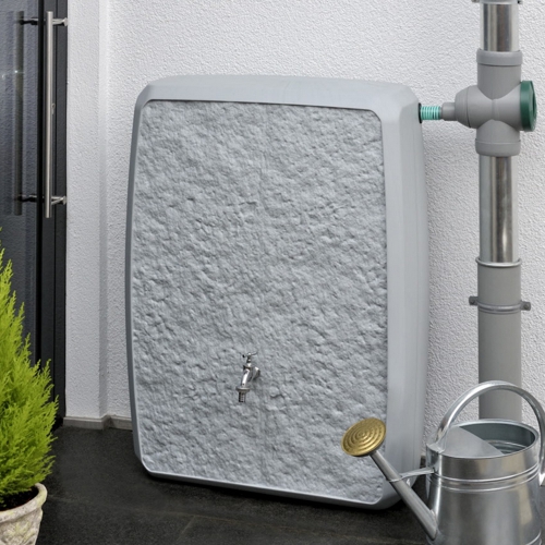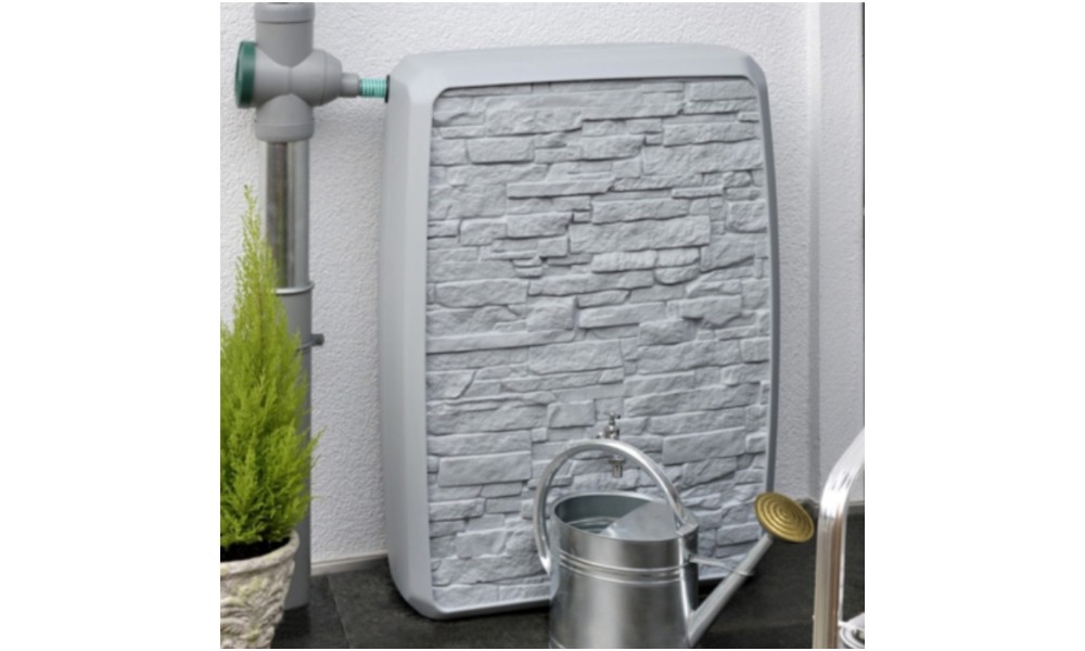 Schlichter, eleganter Regenspeicher aus besonders hochwertigem Material (HDPE), welches äußerst uv-und witterungsbeständig ist. Eine Besonderheit des Multitanks sind die 2 unterschiedlichen Designs, vereint in einem Regenspeicher. Eine ist mit Riemchen verziert, während die andere Seite eine Optik aus Schiefer besitzt.
