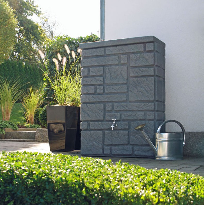Diese Regentonne mit einem Fassungsvolumen von 300 Litern besticht durch ihre naturgetreue Nachbildung einer Natursteinmauer.