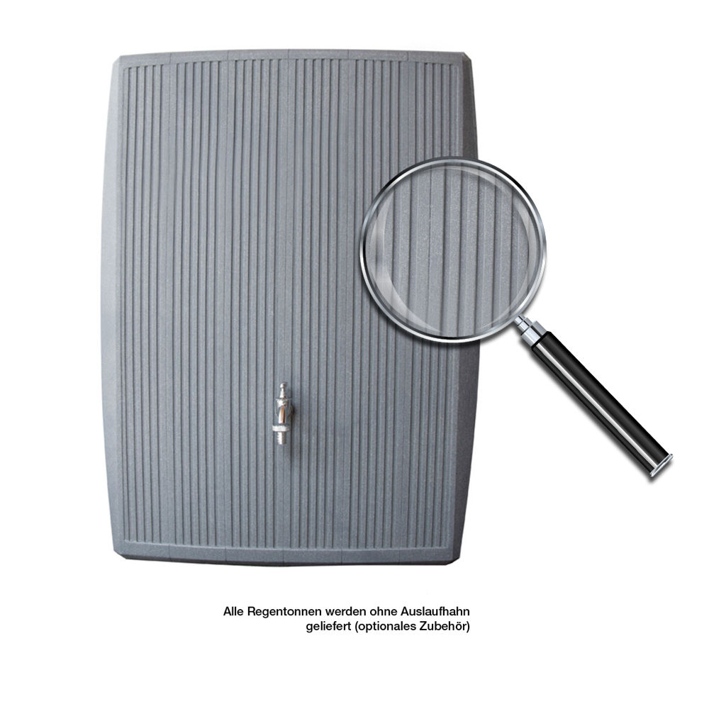 Die Regentonne hat ein großes Fassungsvermögen und ist aus hochwertigem Kunststoff gefertigt, der durch die spezielle Verarbeitung UV- und witterungsbeständig ist. Die schöne Farbe bleibt lange erhalten und bleicht in der Sonne nicht aus. Auf der Vorder- und Rückseite ist die Regentonne mit einem 3/4"-Gewinde aus Messing ausgestattet, sodass ein Wasserhahn angeschlossen werden kann. Mit zwei seitlichen Auslauföffnungen können Sie den Regenspeicher mit weiteren Tanks verbinden oder während der Frostperiode ganz einfach entleeren. Sammeln Sie Ihr Regenwasser für den Garten in dem großen und modernen Regenspeicher Concrete in Betongrau.